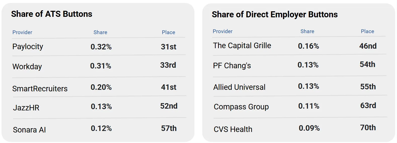 Among direct-employer buttons, the leaders are concentrated in frontline, high-volume hiring sectors: food service and hospitality (The Capital Grille, PF Chang’s, Compass Group), large outsourced services/security (Allied Universal), and retail healthcare (CVS Health). This suggests that Google’s direct-apply visibility is especially strong for employers with constant, broad recruitment needs and high turnover, who benefit from driving candidates straight to their own career sites.