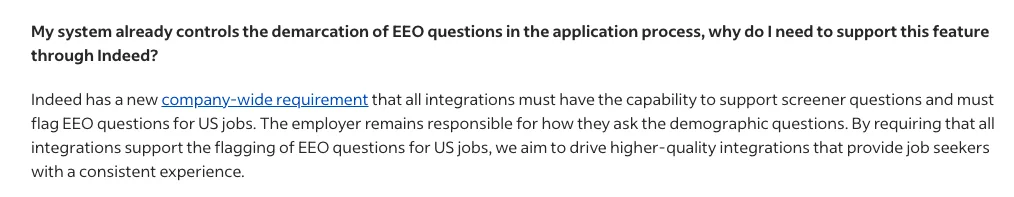 CAVEAT: When completing EEO questions on Indeed Apply, Indeed says this data usage is covered by the employer privacy policy. It says the data won’t be used by Indeed with a link out to their demographics FAQ, which does not explicitly say they will not use employer required data collected.