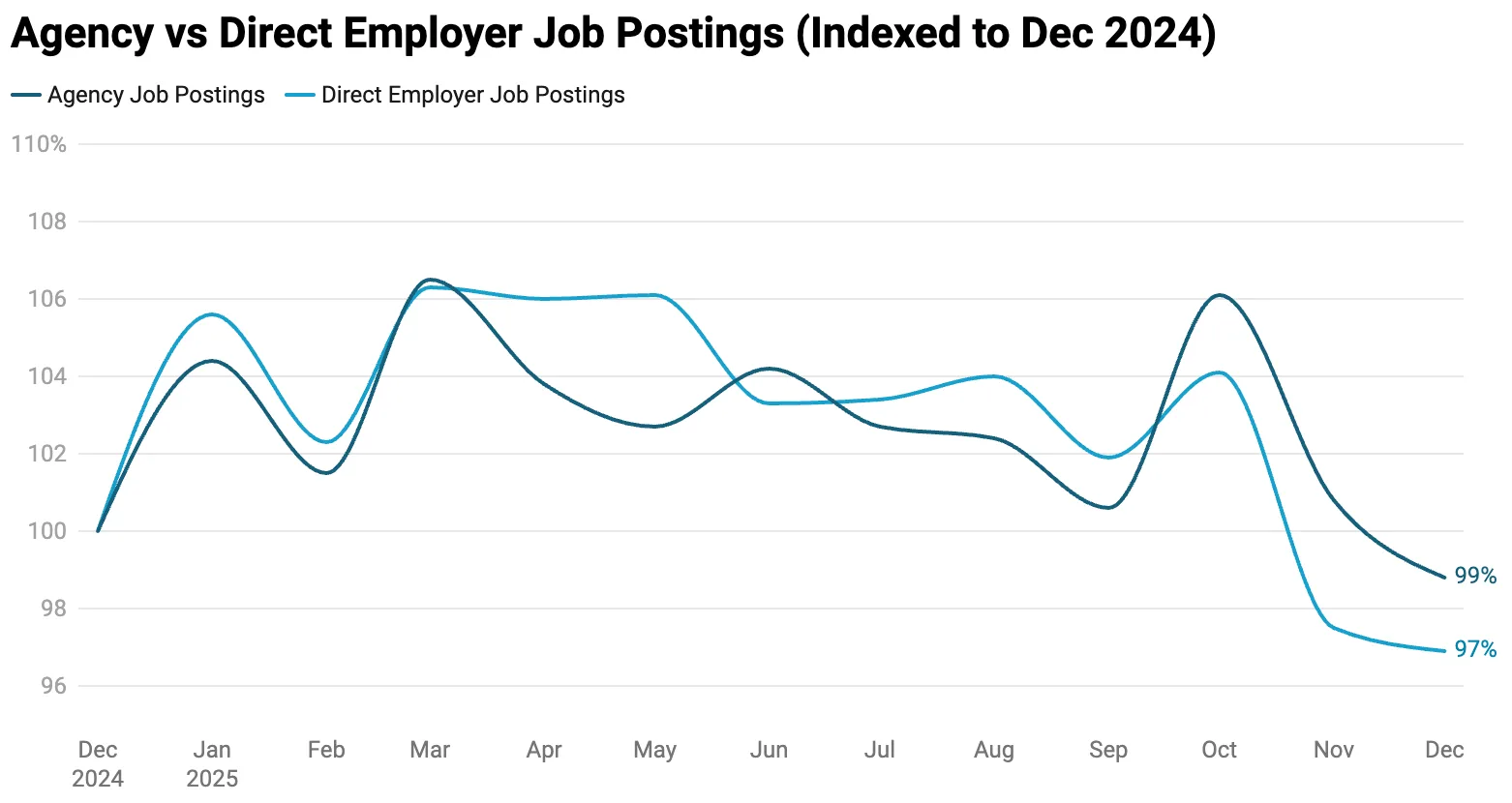 By December, recruitment agencies accounted for 18.6% of all active job postings, and their posting activity proved slightly more resilient than that of direct employers. Direct employer postings ended the year 4.1% below December 2024 levels, compared to a 1.2% decline among agencies.