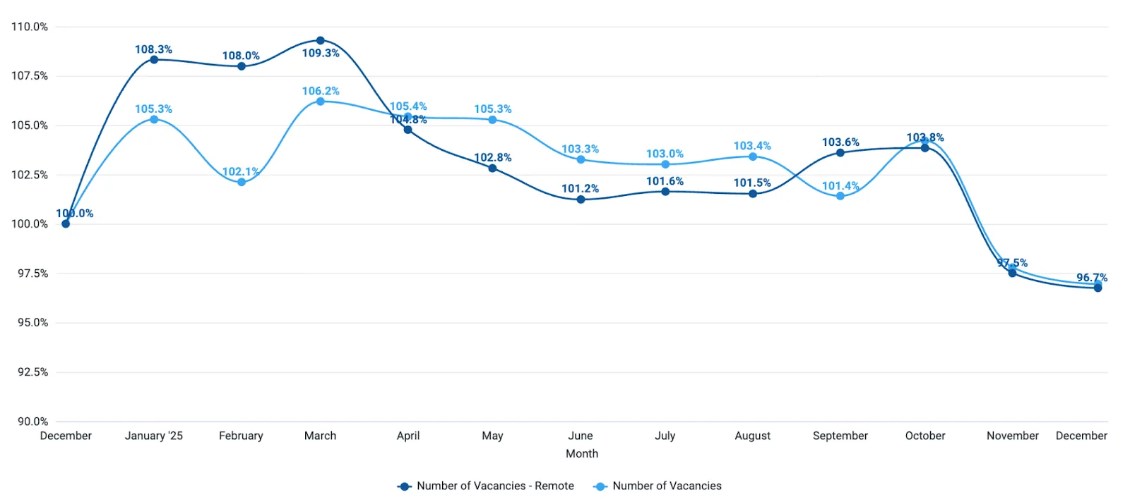 Importantly, remote job postings tracked overall vacancy trends throughout the year. They neither expanded nor collapsed, reinforcing the view that remote work has stabilized rather than serving as a new growth driver in employer hiring intent.