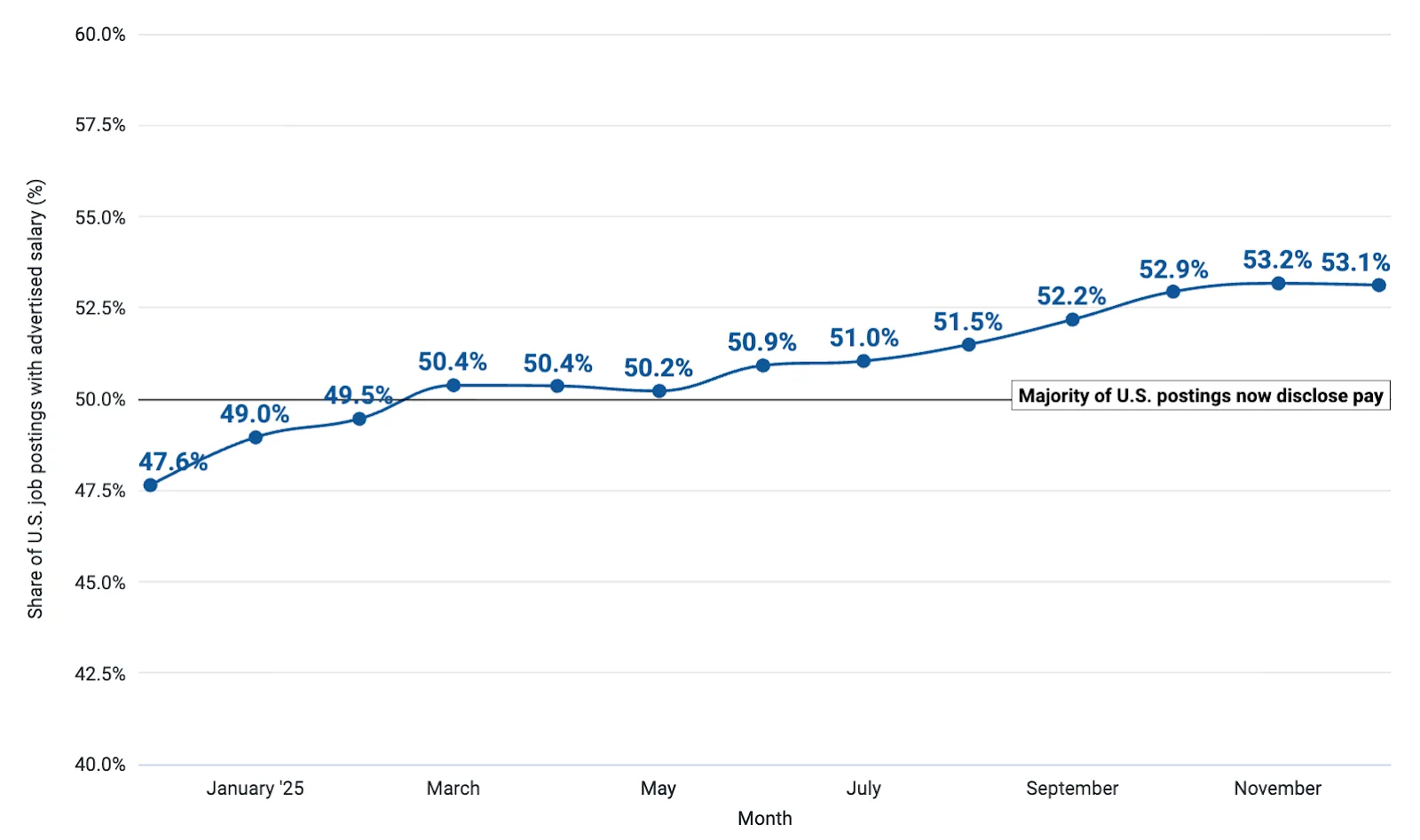 Salary transparency crossed a notable threshold as well. More than half of U.S. job postings now include pay information, driven in part by expanded state-level disclosure requirements. Transparency is becoming a structural feature of job advertising rather than a differentiator.