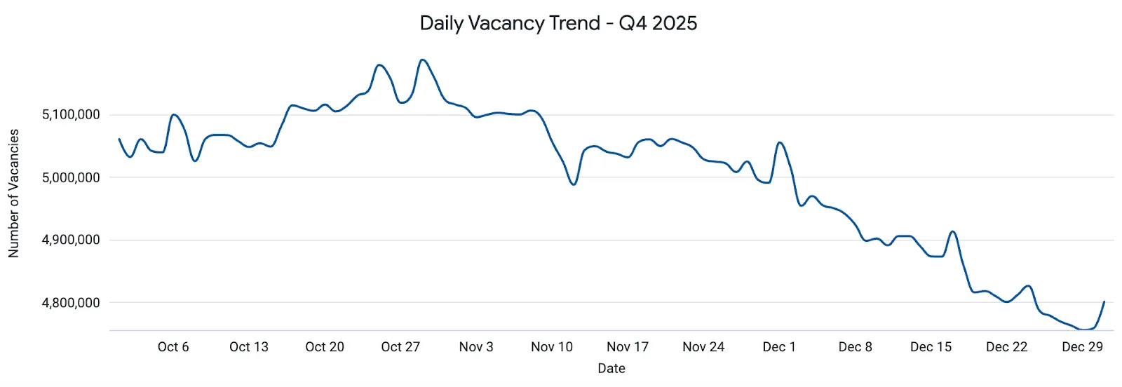 By the fourth quarter, active job postings declined another 5.8%, consistent with typical year-end posting expirations and seasonal slowdowns. Importantly, the data shows early signs of stabilization at the very end of December, ahead of the usual January rebound in employer hiring intent.