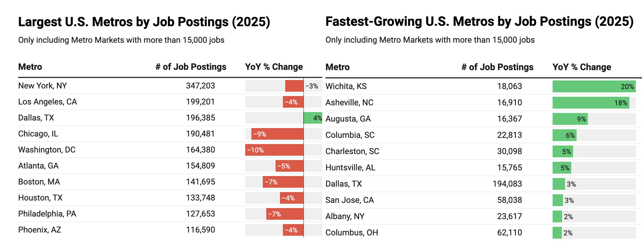 At the metro level, the pattern sharpened. Many of the largest urban markets saw reduced posting volumes, while a smaller group of metros, particularly in the Southeast, recorded increases in employer hiring intent.